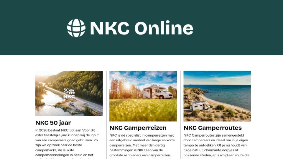 NKC is dé specialist in camperreizen met een uitgebreid aanbod van lange en korte camperreizen. Met meer dan dertig bestemmingen is NKC een van de grootste aanbieders van camperreizen. Jouw volgende camperavontuur begint hier!