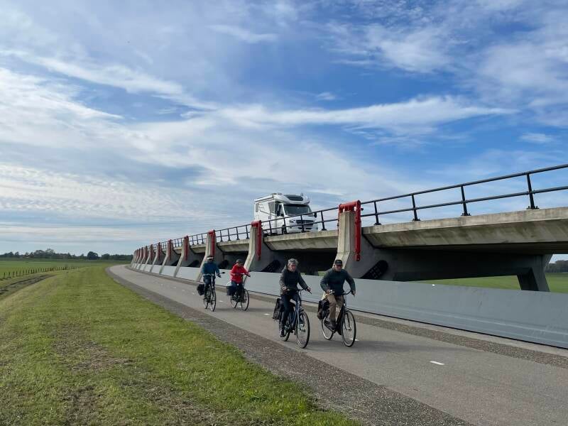 We starten onze ontdekkingstocht bij het inlaatwerk bij Veessen. Hier is een brug gebouwd met een bijna achthonderd meter lange inlaatdrempel. Het is een vreemde gewaarwording, een brug zo midden in het weiland. Velen zal het misschien niet eens opvallen, maar wij bekijken die inlaat natuurlijk even. Als het IJsselwater een hoogte van 5,65 meter boven NAP bij de inlaat bereikt, gaat deze open. De geul stroomt dan vol en het water zal met de stroming van de IJssel meegaan. De waterstand in de IJssel daalt hierdoor 71 centimeter bij Veessen. Dit gebeurt gemiddeld één keer in een mensenleven. Althans dat zijn de voorspellingen nu, maar we weten allemaal dat de situatie snel kan veranderen. Zo werd in december 2023 bij hoogwater de inlaat weliswaar niet gebruikt, maar wel in gereedheid gebracht. Dat is nu niet het geval: we zien dat de hydraulische cilinders niet zijn vastgemaakt aan de kleppen. De IJssel stroomt verderop dan ook rustig in de eigen bedding.